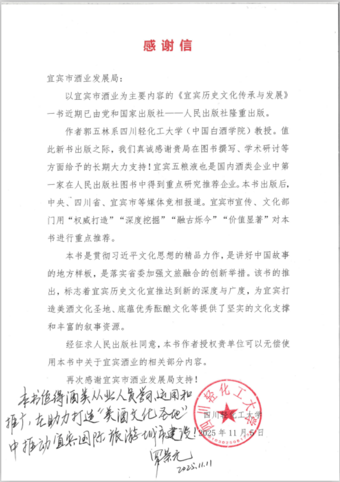 2025年11月5日,四川輕化工大學向宜賓市酒業發展局致感謝信。感謝信全文如下: